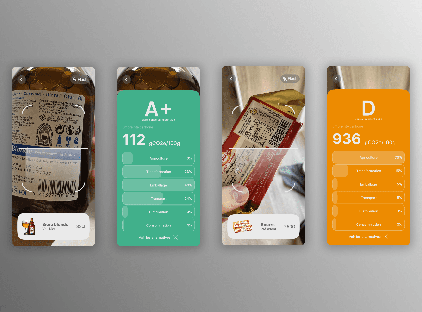 The visual direction is based on a bichromatic design system, using strong flat colors to clearly represent impact levels. A rating scale from A+ to E, associated with specific colors, allows users to instantly understand the environmental cost of a product. The interface prioritizes usability, with the barcode scan positioned as the central action, reinforcing the app’s primary purpose: raising awareness and encouraging more responsible consumption through clarity and engagement.