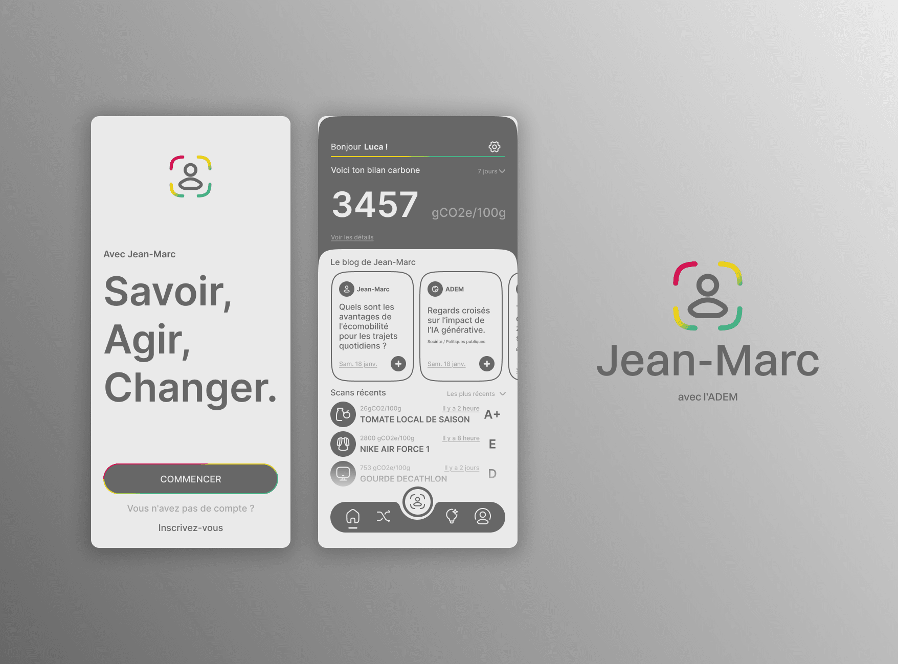 Jean-Marc – ADEM is a mobile application concept designed to help users understand the carbon footprint of the products they consume. By scanning a product’s barcode, users instantly access its environmental impact, expressed in CO₂ equivalent, through a simple and intuitive interface. The project aims to make environmental data accessible and actionable in everyday consumption.